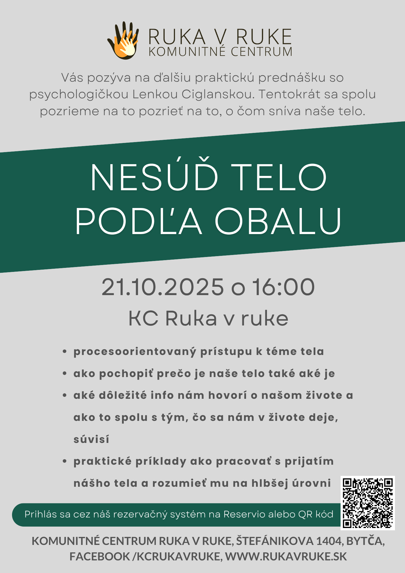 Komunitné centrum Ruka v ruke je občianske združenie, ktoré chce ponúkať rôzne možnosti ako sa navzájom stretávať, spoznávať, prepájať – tvoriť komunitu.